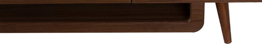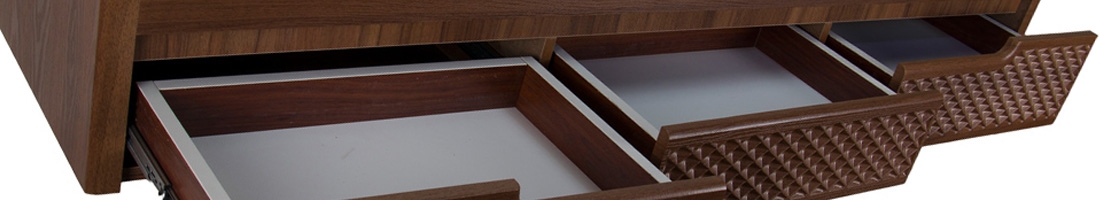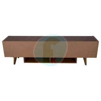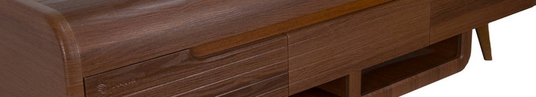 میز تلویزیون مدل رز خطی یک تکه ثابت، با بهره گیری از صفحه CNC یک تکه و منحنی و نیز برش های خطی استفاده شده در نمای کشوها، تبدیل به یک مدل خاص و لوکس شده که به جرات می توان گفت یکی از نادرترین مدل های موجود در بازار می باشد؛ طول محصول با توجه به یک تکه بودن، 157 سانتی متر، عرض محصول 37 سانتی متر و ارتفاع آن 47 سانتی متر می باشد . طول صفحه زیر تلویزیون، 157 سانتی متر بوده که فضای مناسبی را در اختیار شما قرار می دهد. جنسی که این محصول را مقاوم و با دوام ساخته، کاملا از نوع MDF می باشد . این محصول از 3 کشو ثابت و 1 طبقه دو تکه میانی تشکیل شده است و این امکان را به شما می دهد که تجهیزات صوتی و تصویری خود را در طبقه میانی زیرین و لوازم اضافی را در کشوها قرار دهید . این میز تلویزیون یکی از مناسب ترین مدل ها از نظر مدل و حجم و فضای مفید و نیز ظاهری لوکس، می باشد . در این محصول، علاوه بر سه کشو با فضای وسیع، یک باکس دو تکه هم در زیر این کشوها تعبیه گردیده و این امکان را به شما می دهد تا لوازم صوتی و تصویری خود را به تفکیک در این باکس ها قرار دهید . ریل استفاده شده در این محصول، از نوع دو زمانه با کیفیت بالا می باشد. 3 کشو و 1 طبقه دو تکه استفاده شده در این مدل، یک مزیت منحصر به فرد می باشد که طیف وسیعی از لوازم اضافی را در خود جای می دهد . جهت باز و بسته کردن کشوها، به صورت تاچ و مگنتی و به راحتی می توانید از تمام محتوای کشو استفاده کنید و با فشار دست آن را ببندید؛ این مزیت باعث شده تا دستگیره ها حذف گردند . یکی از قسمت هایی که در نمای محصول چشم نواز است، قسمت منحنی لبه صفحه میز تلویزیون می باشد؛ رگه های براق طرح چوب و منحنی لبه محصول، طرح زنبوری روی کشوها، پایه های بلند و کشیده و چوبی مجصول، همه و همه بیانگر این هستند که زیبایی در این مدل، واقعا برازنده یک خرید رضایتمند است .پایه های استفاده شده در محصول از جنس چوب می باشد که بسیار مقاوم و زیبا طراحی شده است. ایده ی استفاده از طرح خطی در نمای این محصول، ناظر به زیبایی این مدل از میز تلویزیون بوده که حقیقتا در واقع ایده ی موفقی به نظر می آید؛ بهره گیری از ایده های کلاسیک و ساده در عین حال لوکس در صنعت چوب، امثال این مدل را مناسب فضاهای رسمی و اداری نیز می گرداند .